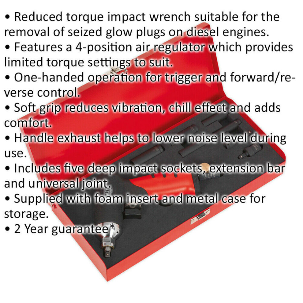 Reduced torque impact wrench suitable for the removal of seized glow plugs on diesel engines. Features a 4-position air regulator which provides limited torque settings to suit. One-handed operation for trigger and forward/reverse control. Soft grip reduces vibration, chill effect and adds comfort. Handle exhaust helps to lower noise level during use. Includes five deep impact sockets, extension bar and universal joint. Supplied with foam insert and metal storage case.