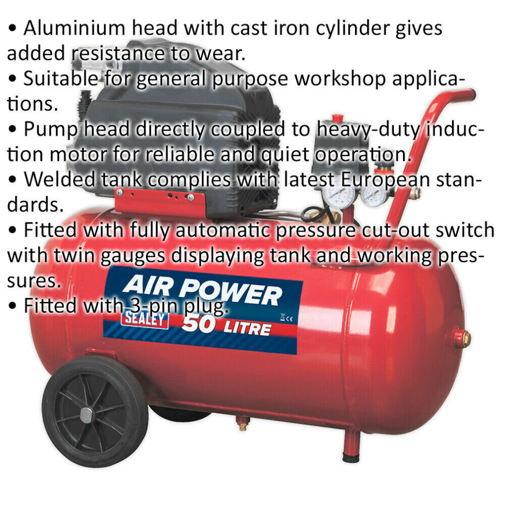 50 Litre Direct Drive Air Compressor - 2hp Motor - Automatic Pressure Cut-Out