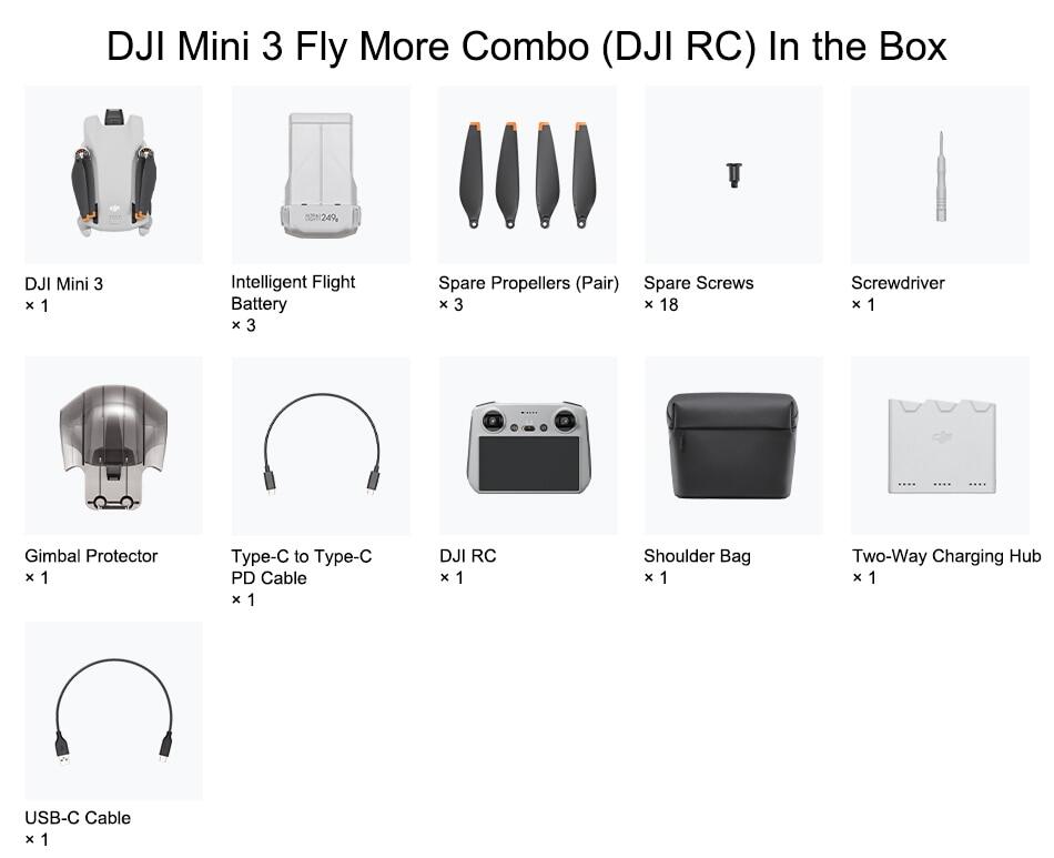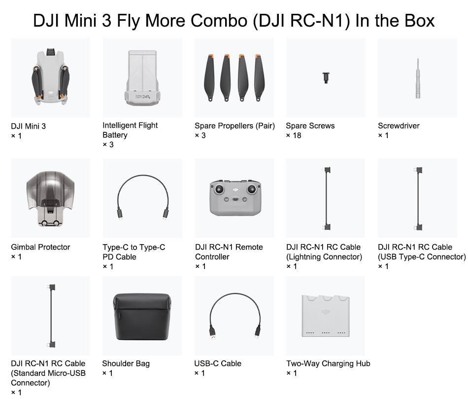 DJI Mini 3 is compatible with DJI RC-N1 Remote Controller and its related accessories, DJI RC, DJI 30W USB-C Charger, DJI 18W USB Charger, DJI Mini 3 Pro Intelligent Flight Battery, DJI Mini 3 Pro Intelligent Flight Battery Plus, DJI Mini 3 Pro Two-Way Charging Hub, DJI Mini 3 Pro Propeller Holder, DJI Mini 3 Pro ND Filters Set, and DJI Mini 3 Pro Shoulder Bag. The above accessories can be purchased at DJI Store.